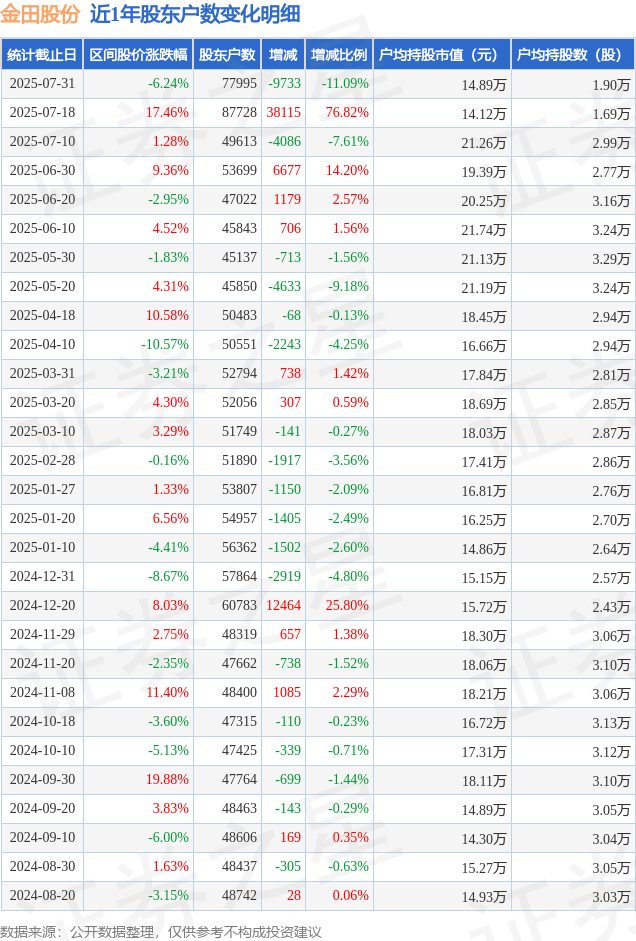 从股价来看,2025年7月18日至2025年7月31日,金田股份区间跌幅为6.24%,在此期间股东户数减少9733.0户,减幅为11.09%。
