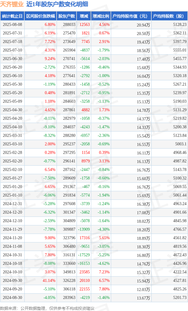 从股价来看,2025年7月31日至2025年8月8日,天齐锂业区间涨幅为6.8%,在此期间股东户数增加1.26万户,增幅为4.56%。